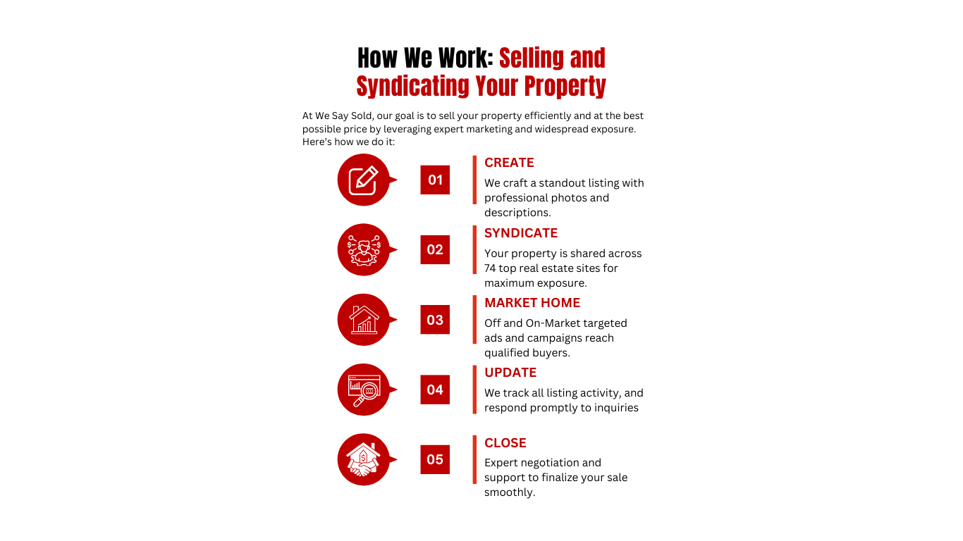 At We Say Sold, we specialize in selling your home efficiently, strategically, and for top dollar. Our comprehensive approach combines standout marketing, wide syndication, and proactive communication to deliver results. From listing creation to final closing, here’s how we ensure your property gets the attention—and the offer—it deserves.